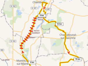 - Le circuit comporte un passage étroit derrière l'église de Thorigné. Si nécessaire, il est possible de le contourner facilement en passant par la rue du Ponceau.
